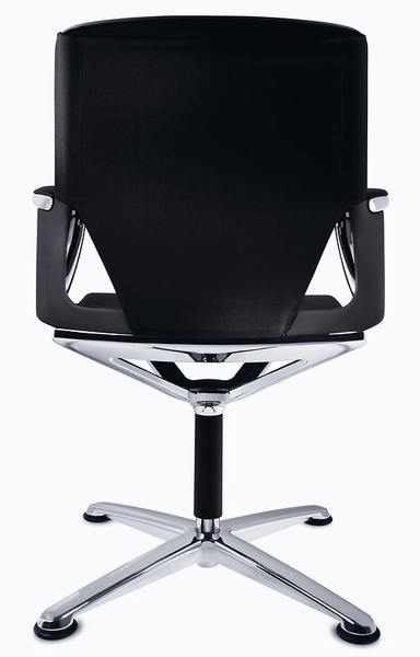 The flexible, fork-shaped backrest made of unbreakable, high-efficiency plastic is covered with an exchangeable, breathable high-tech fabric. Without any upholstery, the backrest adapts to the shape, posture and movement of the person sitting on it.