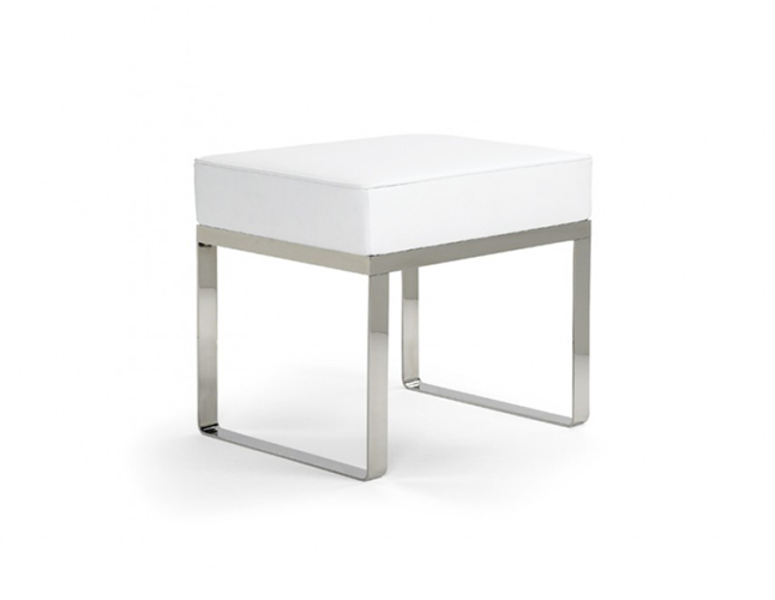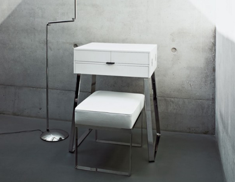 Banu is an item from the Jewel Garden – the name of the Maharajah‘s palace of Indore for which Eckart Muthesius made the design. The frame is polished stainless steel and the upholstery is polyurethane with quilting cotton on a beech frame covered in leather.