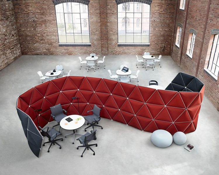 The system has acoustic dampening materials and visual screening. Areas for focused work are easily created out of the open areas.