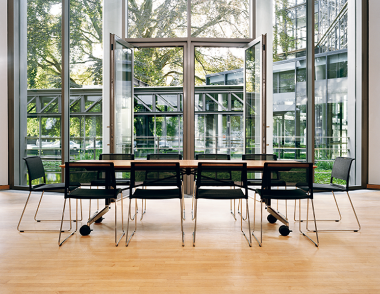 The chair can be stacked up to 15 chairs by themselves and up to 25 with a stacking trolley.