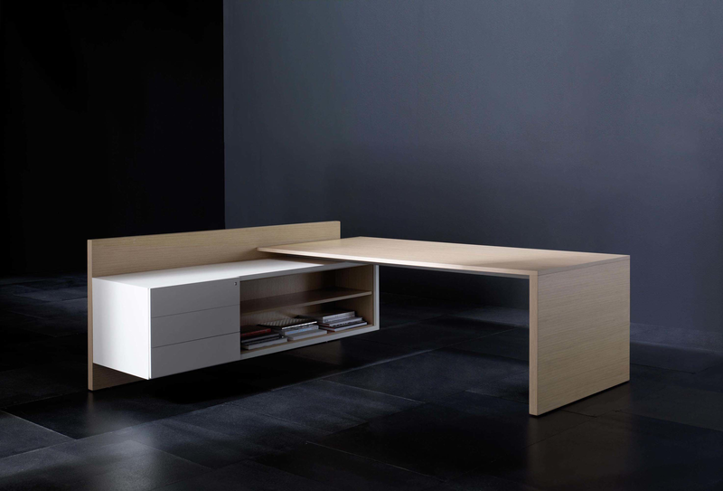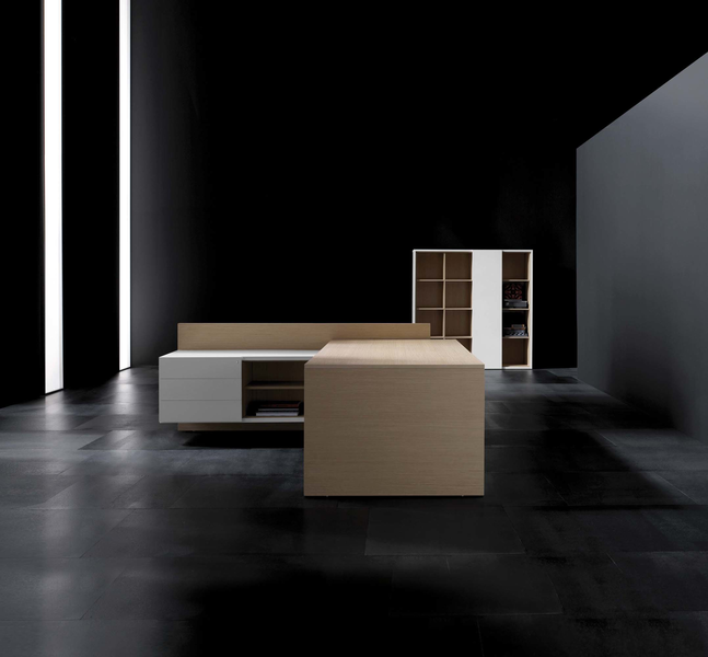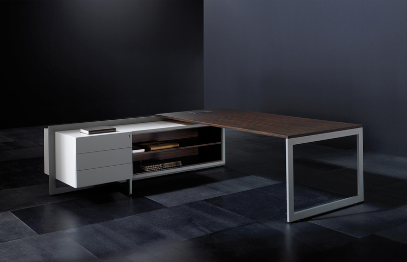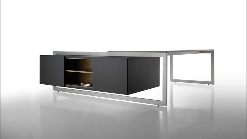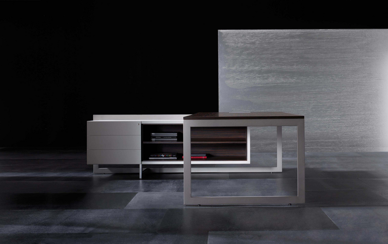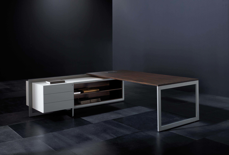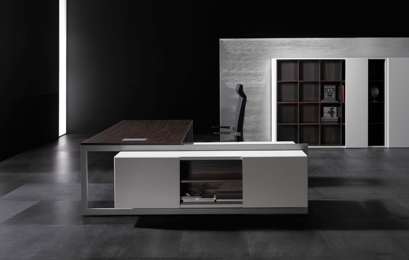 The Vektor range reflects the evolution of traditional executive furniture, moving towards a more up-to-date aesthetic, which is in keeping with new trends in light and avant-garde spaces. The design detail is of importance in the two different styles that form part of this range: an arch-shaped supporting frame with a metal finish and a wall support consisting of a honeycomb-core panel made from the highest quality wood.The design also features an integrated storage system, which is suspended from the frame (both arch-shaped and wall-mounted). The effect created by the suspended storage system adds another distinguishing touch to the design, which has been optimised by and for spatial balance.