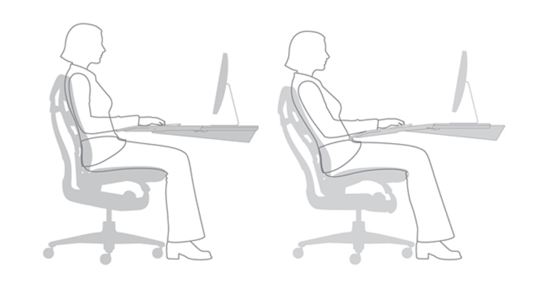 Changing postures requires the person to adjust each element independently. That seldom happens. This is further complicated by ergonomic guidelines that base the design of work areas on an upright seated posture. If the person wants to work in a reclined posture—which has been shown to offer health benefits—moving puts everything out of alignment.