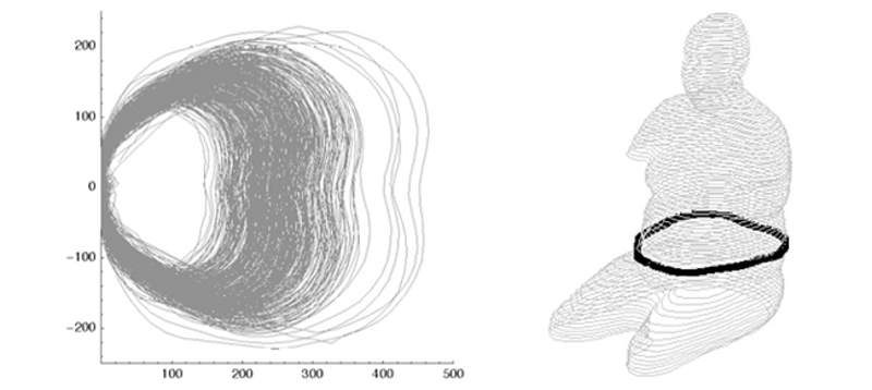 The infield surface nearest the person has the form of a “body pocket.” Designed to accommodate a wide range of body sizes and shapes, the pocket shape is derived from three-dimensional scans of human torso models. Planar slices estimated at the mid-lumbar level were taken of 380 seated subjects from the CAESAR anthropometric survey. / See Figure 4 /