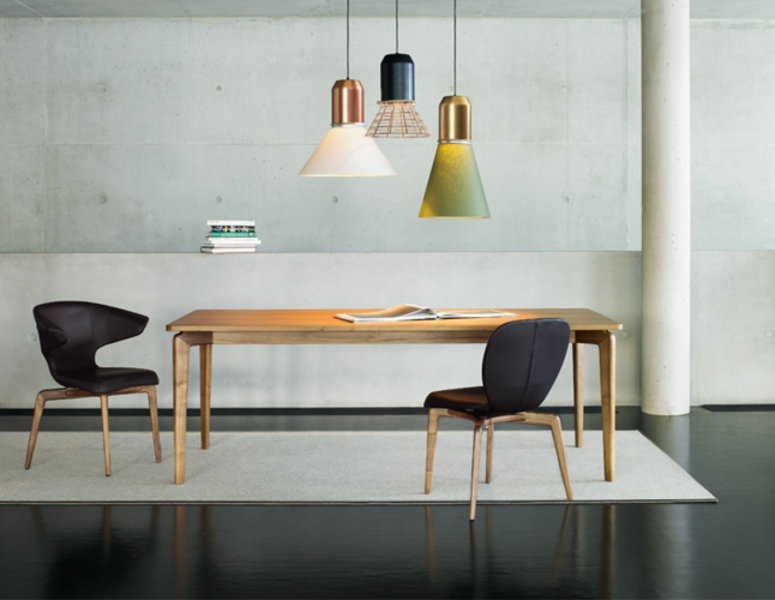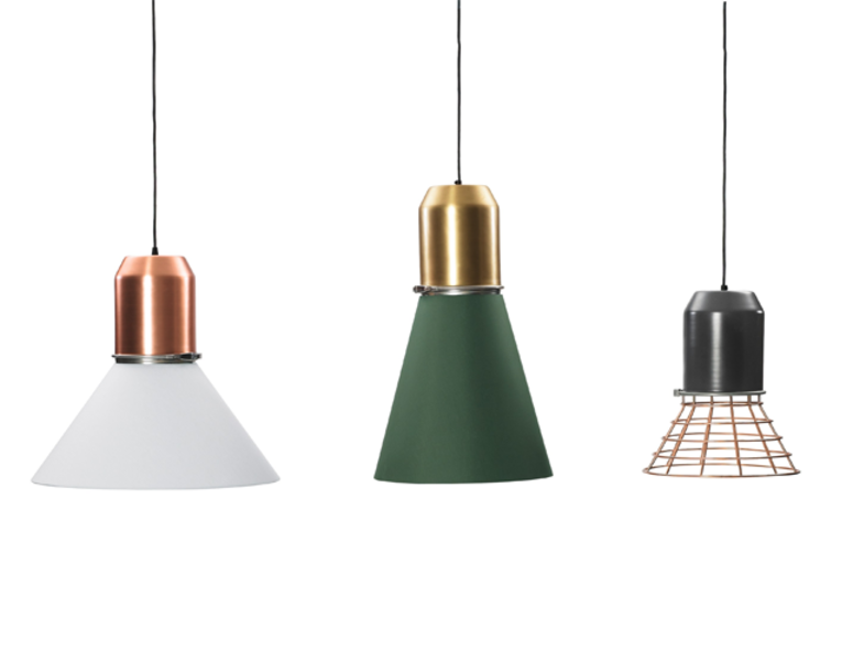 The Bell Lights family can be combined with a range of bulb sockets, materials and colors to complement different interiors. The bulb socket is offered in brass or copper with varnish or lacquered metal.
