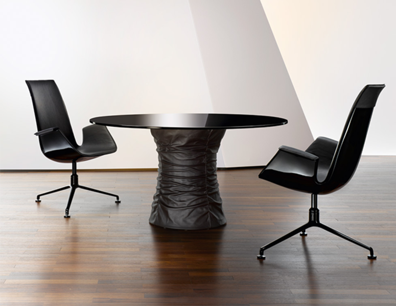 Bellows has a round form – the ultimate shape that attracts communication in a close circle. The unique combination of warm and cool materials – leather and glass – create its unique feeling and elegance.