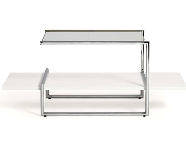 Consus комбинира стъкло, неръждаема стомана и лак в шедьовър на модернизма, който е с ясни геометрични линии и игрива гъвкавост. Долният рафт може да бъде отстранен.