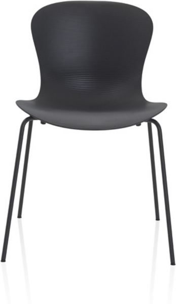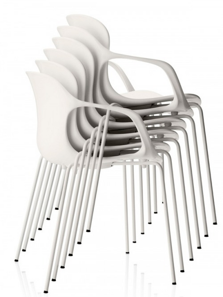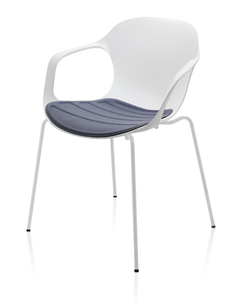 NAP™ comes in several varieties: stackable with 4 legs or sled and as bar stool or counter stool, all with and without arms. the chair has a high gloss back, and the front of the shell is matt with ripples to emphasize the geometry of the chair. the chair is also available with seat upholstery - assembled when delivered or purchased separately. the base is available in chromed steel, powder coated in colours matching the shell or with a wooden base in oak veneer.