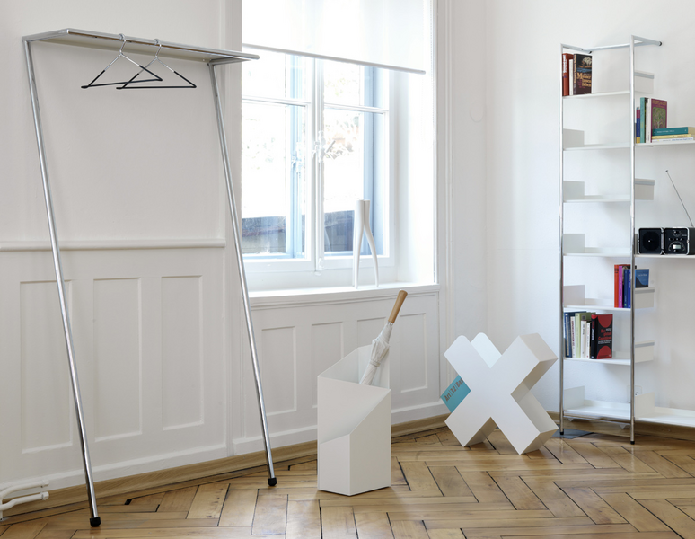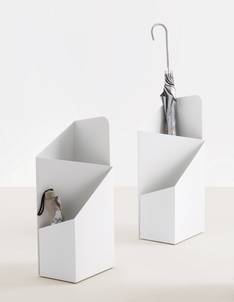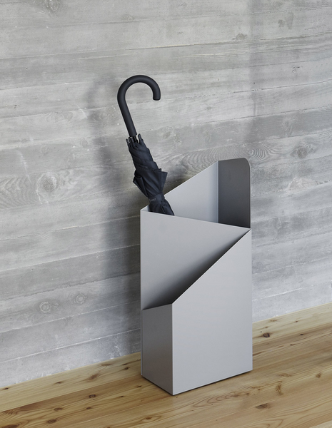 Folded form, function and a surprisingly simple idea: The umbrella stand Via is suitable for large screens as small tots. The drip trays made ​​of rubber prevent sliding around the screen tips and catch the water.