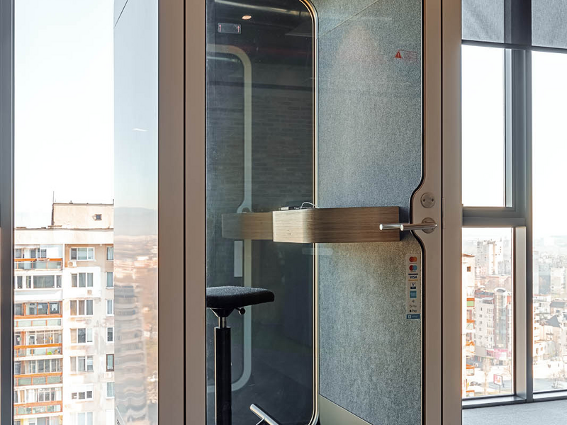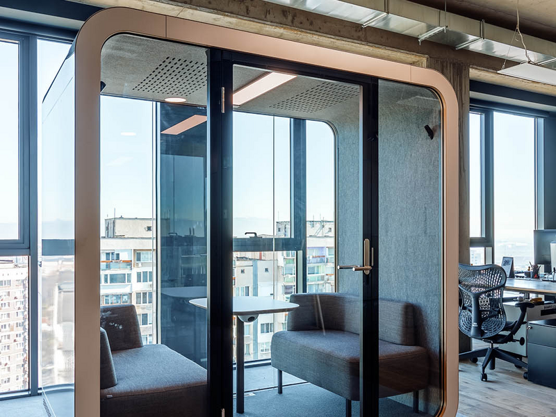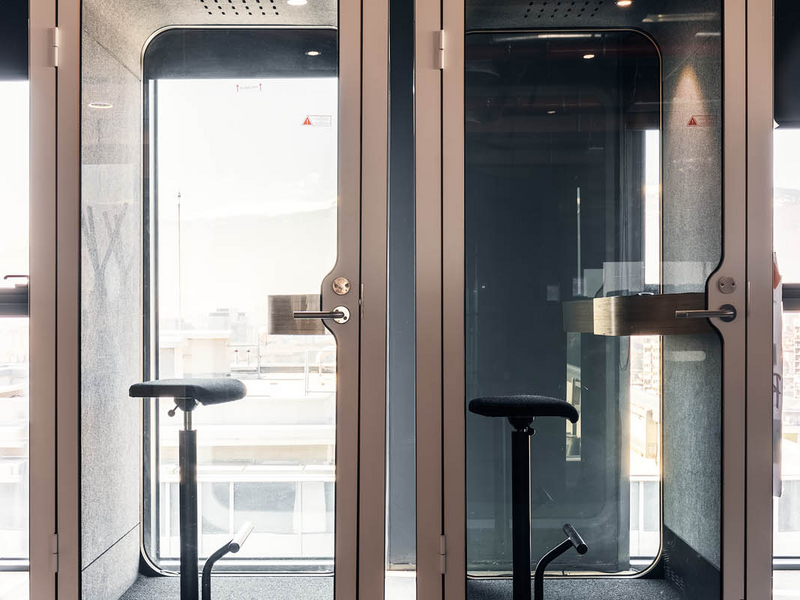 The acoustics in the office is guaranteed by the booths from Framery brand. They can be used both for personal and conference calls, and also as a small meeting rooms.
