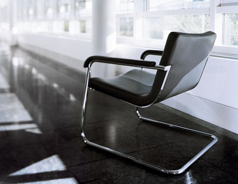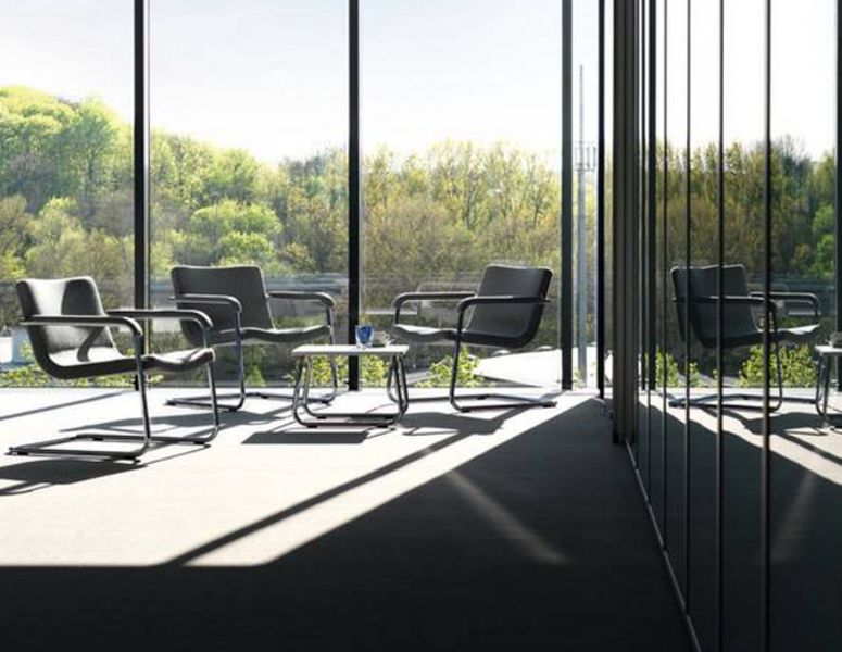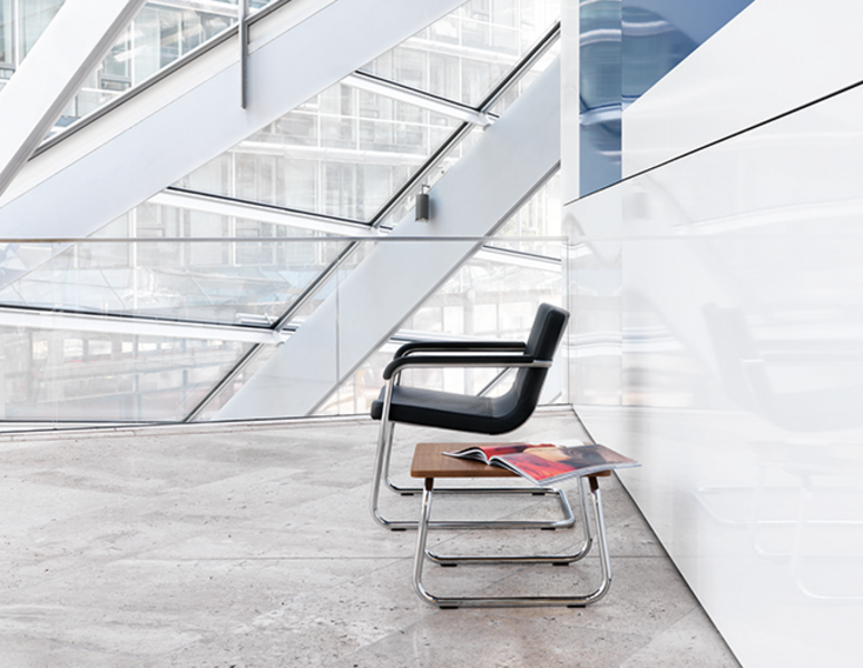 The design of the Cura chair adds refreshing touches to the traditional cantilever chair. It is lightweight and welcomes people, inviting them to communicate. The design allows Cura to be placed in all work areas bledning naturally with the environement.