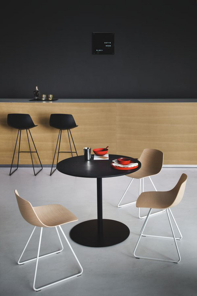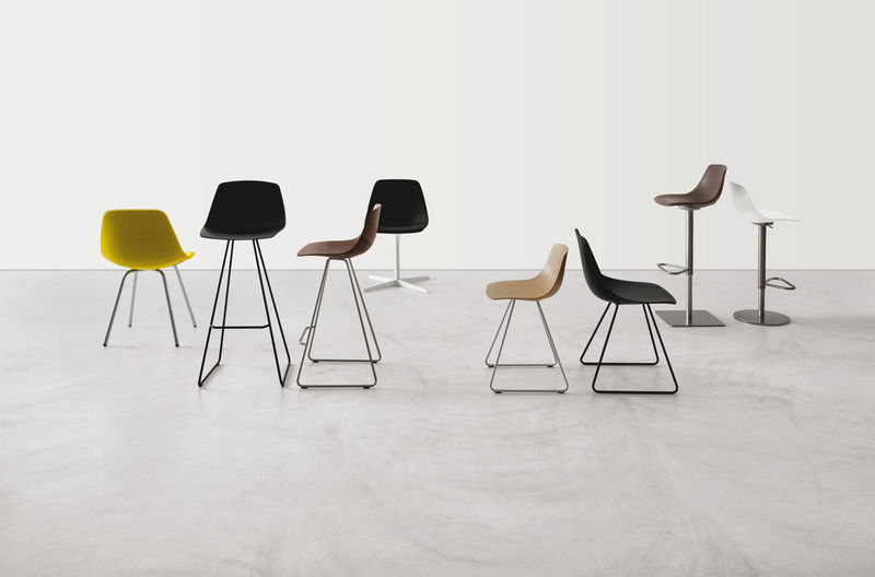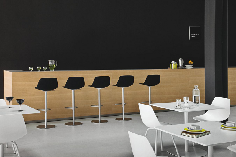 When essentiality envelops. A matter of technology, and it is the 3D worked sheet of wood. A question of a hand that draws thinking of itself, of the palm that holds water and sand. Thus was born MIUNN, sinuous, inviting in the seat and perfect in supporting the back. In the chair and stool version it is combined with tops of different heights. Peacefully, as it was thought.