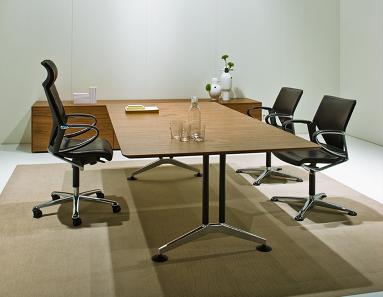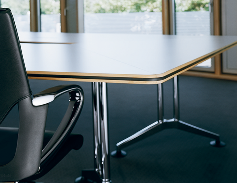 Страничният ръб на Logon е вграден в масата, за да осигури издръжливост във времето и непрестанно реконфигуриране. Масата има т-образни крака и опция за 3 вида завършеци: меламин, фурнир и линолеум.