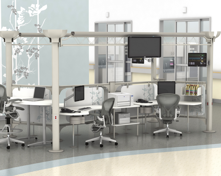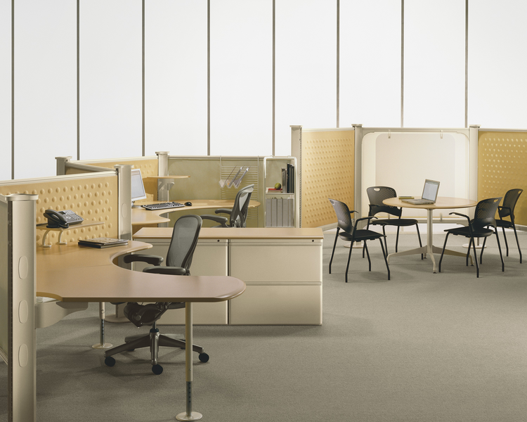 There are no panels in Resolve, instead the structure is based on poles and screens that allow for high adjustability when creating office settings. The materials allow the movement of light and air, while the user can control the level of privacy with rolling screens and acoustic technology that reduces the noise.