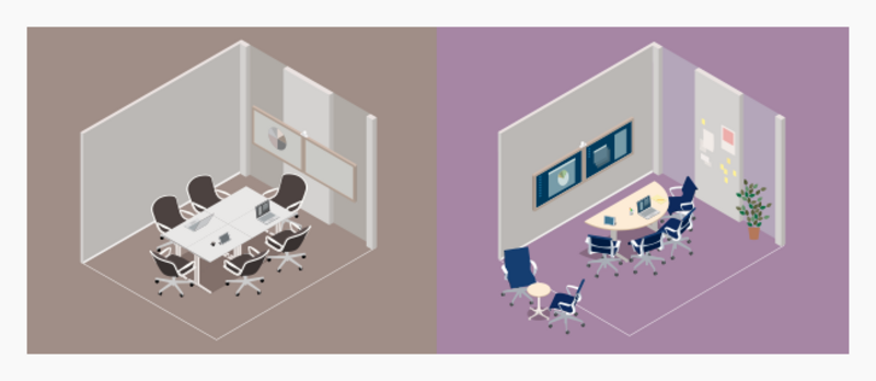 Прилагането на по-интегрирани принципи за проектиране на работното място, бързо трансформира стаите в добре развити центрове. Проучване за използване на пространството потвърди, че броят на столове в стаите, може да бъде намален. Това, съчетано с новата маса с извита форма, предназначена да подобри видимостта на всички участници, създава повече пространство, което насърчава движението из стаята и използването на цифровите и аналоговите инструменти. Допълнителната седалка извън стаите се използва за създаване на място където хората могат да споделят идеи, преди и след заседанията, което е друг тип Living Office настройка (ние наричаме тази дейност Warm Up, Cool Down).