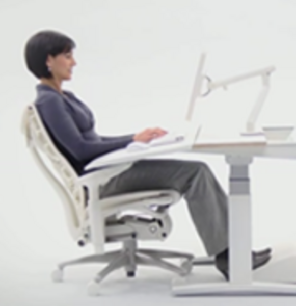 Sitting in front of the chair for prolonged periods of time makes us lose the natural S curve of the spine and slouch. We need to have stability provided by both the seat and the back. We need to have our feet on the ground with a comfortable 90 degree angle that does not constrict the blood flow. Avoid sitting at the edge of the chair. If we are not using the back of the chair we are not using the full functionality of the chair.