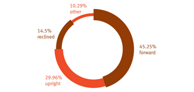 Field observations indicate that people tend to sit in a way that makes their posture conform to the fixed nature of display and furniture. The Office Seating Behaviors study conducted by researchers at Herman Miller found that people performing computer-related tasks exhibited upright or forward-leaning postures nearly 75% of the time (Dowell, Green, and Yuan, 2001). / See Figure 2 /