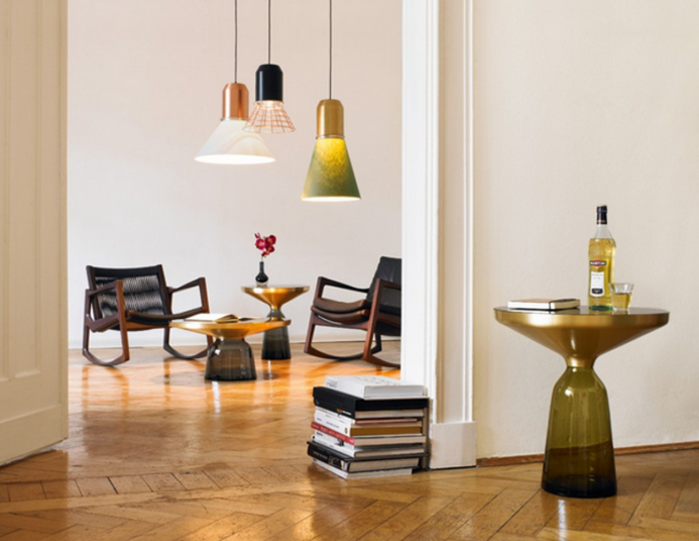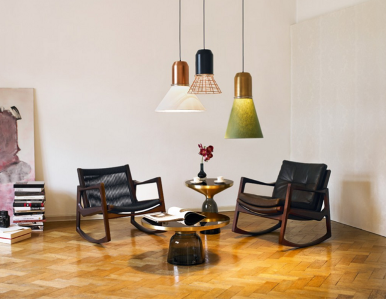The Bell Lights family can be combined with a range of bulb sockets, materials and colors to complement different interiors. The bulb socket is offered in brass or copper with varnish or lacquered metal.