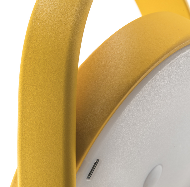 Giravolta is a wireless lighting distinguished by a contemporary design and suitable for outdoor environments. Two discs in plastic material, the base and the LED diffuser which rotates 360 degrees and directs the light, are surrounded by an arc made in extruded aluminium to create a practical handle. The luminaire incorporates the LED board, the lithium battery, the micro USB device for recharge and the power button. A magnet in the base as optional allows the fixing of the lighting on metal surfaces, even wall.