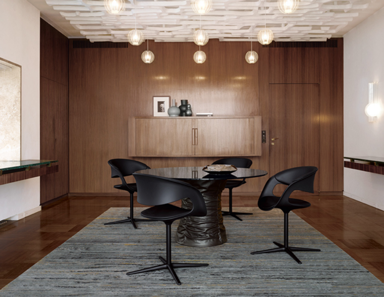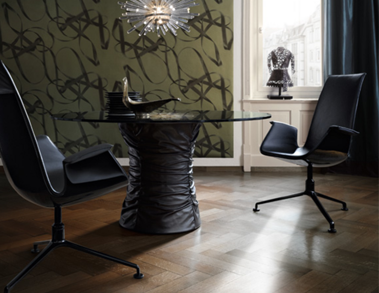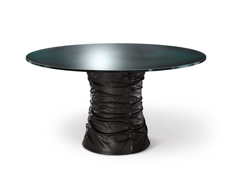 Bellows has a round form – the ultimate shape that attracts communication in a close circle. The unique combination of warm and cool materials – leather and glass – create its unique feeling and elegance.