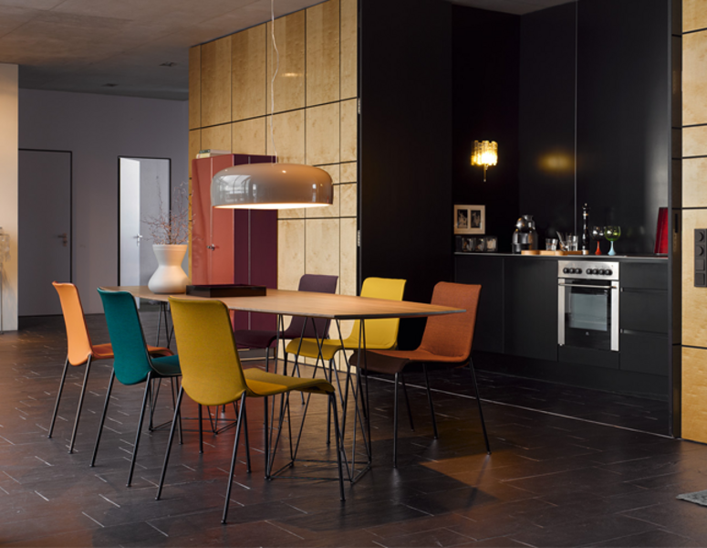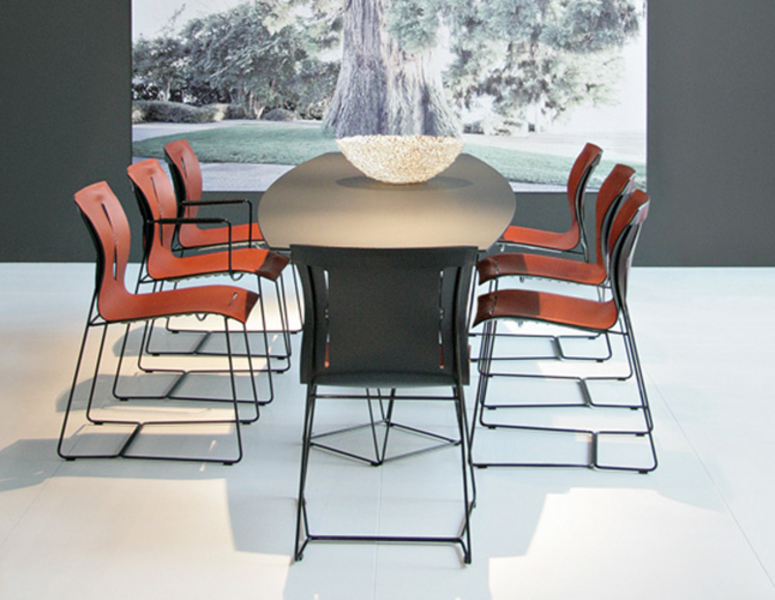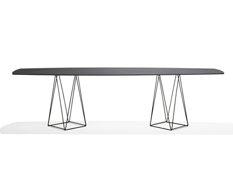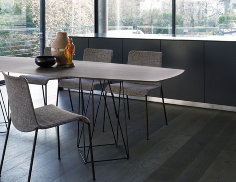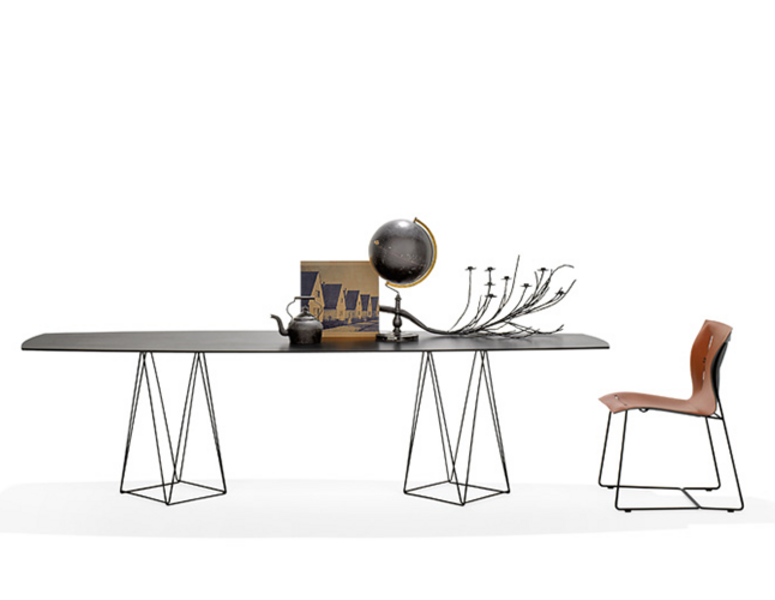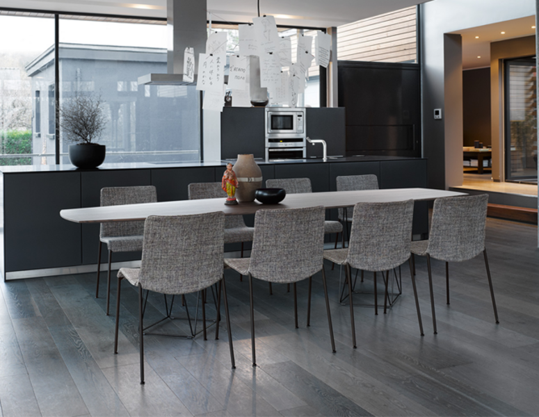 Joco Dining Table’s design plays with the perception of space and perspective. The surface looks as if it floats atop the light base with crisp lines. Design that is both powerful and delicate.