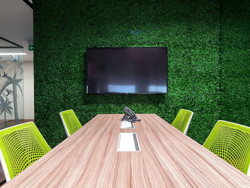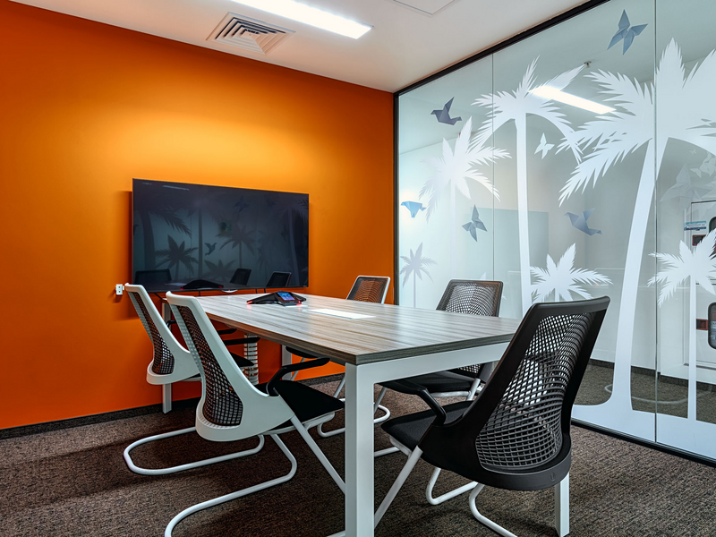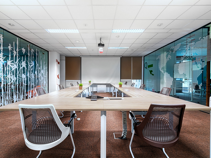 The open space is complemented by many different in size, color and branding conference rooms. The conference tables and chairs are also from the Herman Miller brand.